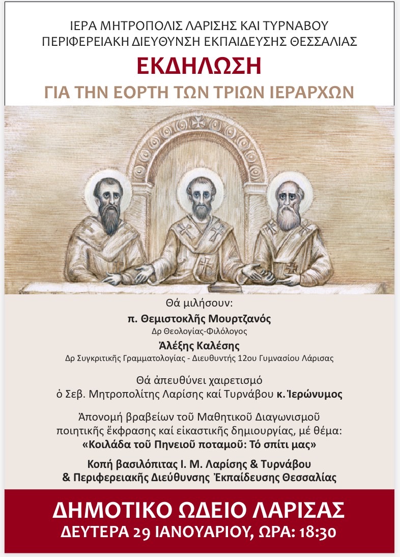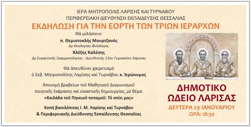 Η Ιερά Μητρόπολη Λαρίσης και Τυρνάβου, με την ευκαιρία της Εορτής των Τριών Ιεραρχών, Πατέρων και Διδασκάλων της Εκκλησίας μας και προστατών της Ελληνορθοδόξου Παιδείας και Παράδοσης, διοργανώνει εκδήλωση στο Δημοτικό Ωδείο Λάρισας την Δευτέρα 29 Ιανουαρίου 2024 και ώρα 6:30 μ.μ., προκειμένου:
