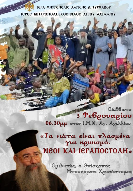 Μια πολύ ενδιαφέρουσα εκδήλωση για τη χριστιανική νεολαία της Λάρισας θα πραγματοποιηθεί το Σάββατο 3 Φεβρουαρίου 2024, στις 6.30 μ.μ. στον Ι. Μ. Ν. Αγίου Αχιλλίου Λαρίσης. Ομιλητής θα είναι ο Ιεραπόστολος Θεοφιλέστατος Επίσκοπος Μουκόμπα της Τανζανίας κ. Χρυσόστομος, ο οποίος, απεθυνόμενος στους νέους, κυρίως, ανθρώπους, θα αναπτύξει το πολύ ενδιαφέρον θέμα: “ΤΑ ΝΙΑΤΑ ΕΙΝΑΙ ΠΛΑΣΜΕΝΑ ΓΙΑ ΤΟΝ ΗΡΩΙΣΜΟ-Νέοι και Ιεραποστολή”.