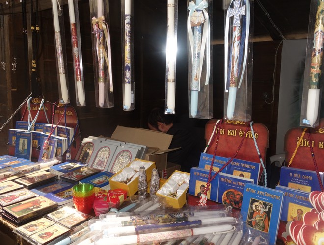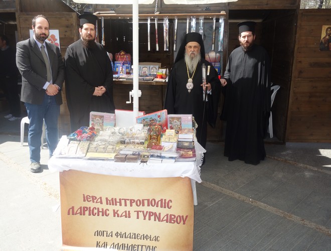 Κατόπιν ο Μητροπολίτης και πολλοί πατέρες επισκέφθηκαν στην κεντρική πλατεία της Λάρισας το ειδικό περίπτερο με πλούσια πασχαλινά δώρα, είδη ευλαβείας και βιβλία, που έστησε η Λογία της Ιεράς Μητροπόλεως με σκοπό την ενίσχυση των πτωχών και ενδεών αδελφών μας κατά τις ημέρες του αγίου Πάσχα. Εκεί συνήντησε πολλούς πιστούς και ομίλησε σχετικώς με πολλούς νέους και νέες του γραφείου Νεότητος της Ιεράς Μητροπόλεως που με πολλή μεγάλη επιμέλεια φρόντισαν το περίπτερο αυτό, προκειμένου να συνεισφέρουν και αυτοί με τον δικό τους τρόπο στην βοήθεια των πασχόντων συνανθρώπων μας.