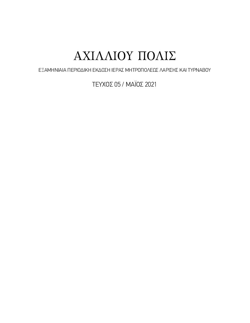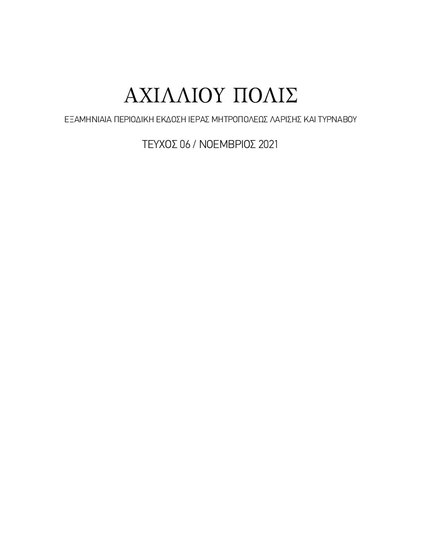 Το επιστημονικού περιοδικό, υπό τον τίτλο «Αχιλλίου Πόλις», το οποίο εκδίδει η Ιερά Μητρόπολη Λαρίσης και Τυρνάβου είναι η νέα πρωτοβουλία του Σεβασμιωτάτου Μητροπολίτου Λαρίσης και Τυρνάβου κ. Ιερωνύμου. Πρόκειται για μία εξαμηνιαία περιοδική έκδοση η οποία θα περιέχει επιστημονικά κείμενα από διάφορα καταξιωμένους επιστήμονες, ερευνητές, συγγραφείς κ.α..